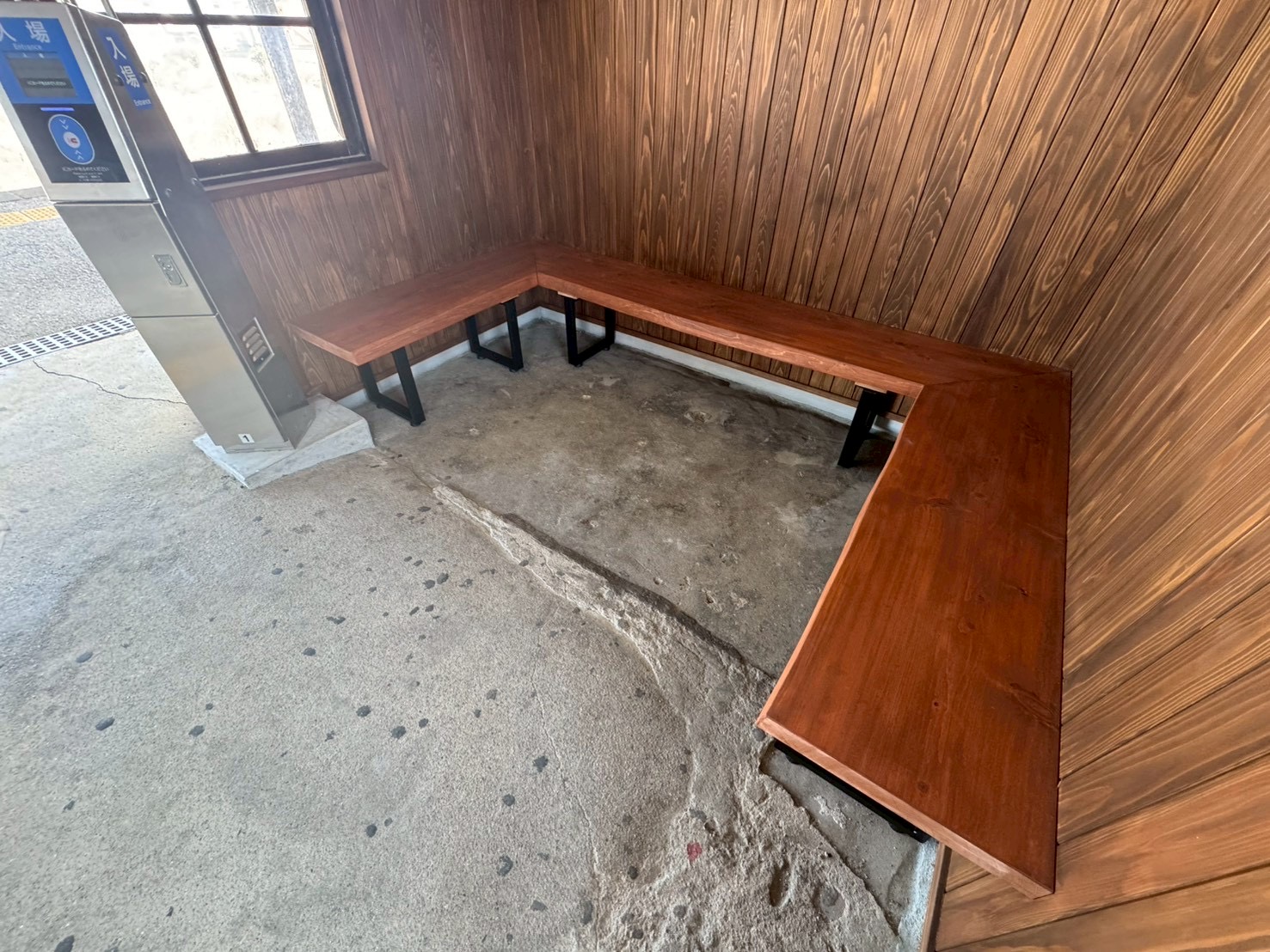 駅待合室の古くなったベンチと腰壁を撤去して新しく製作、設置しました。三重県産の木材を使用して、温かみの感じられる待合室になりました。